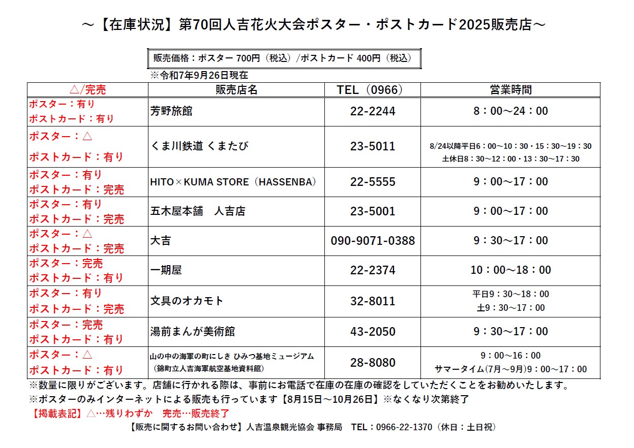 【在庫状況】第70回人吉花火大会ポスター・ポストカード販売店 2025年9月26日/作成者: staff https://hitoyoshionsen.net/media/hitoyoshi-travel_logo.png 0 0 staff https://hitoyoshionsen.net/media/hitoyoshi-travel_logo.png staff2025-09-26 15:56:072025-09-26 15:56:07【在庫状況】第70回人吉花火大会ポスター・ポストカード販売店